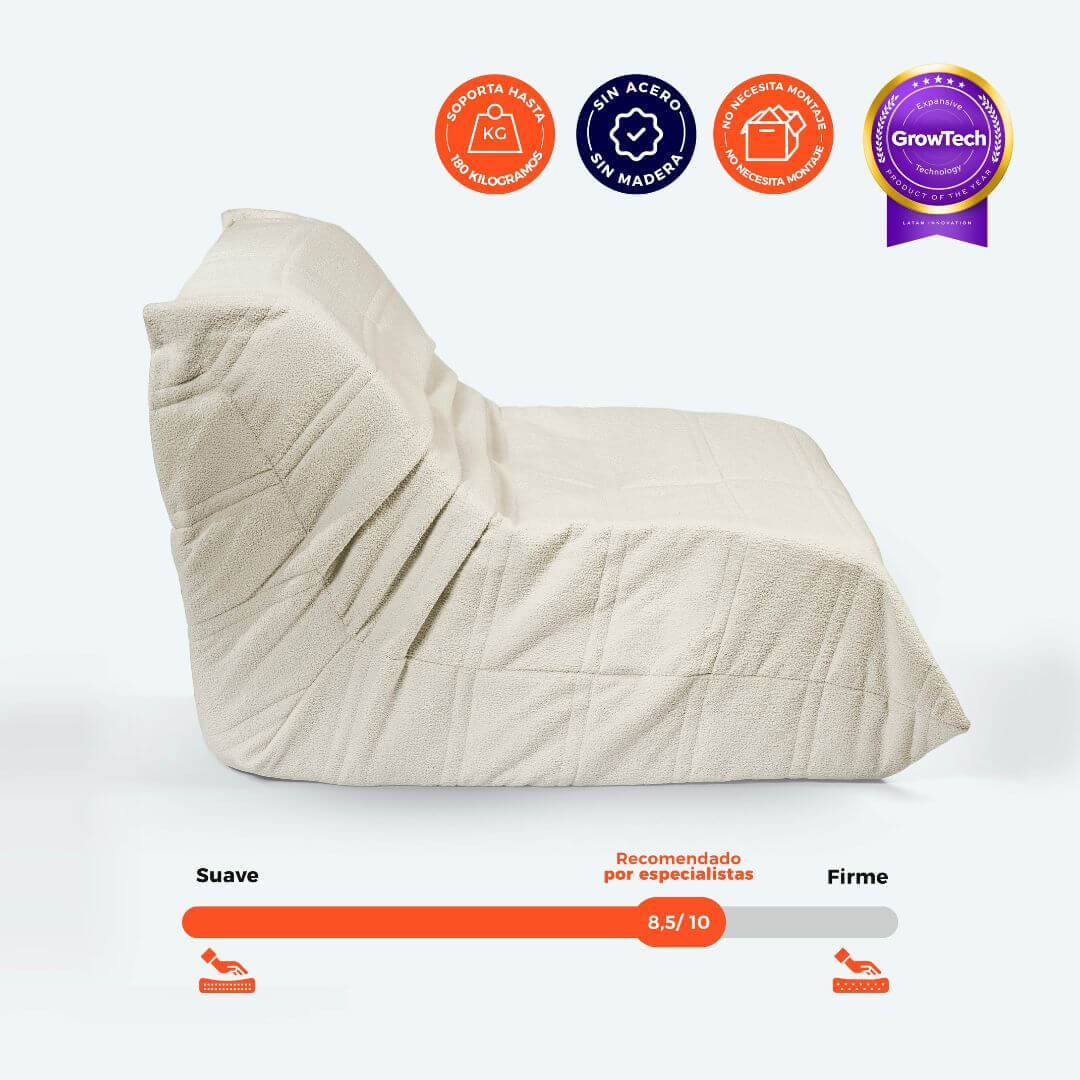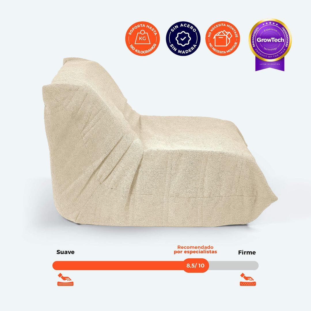 Tecnología GrowTech®: Espuma de alta resiliencia con microceldas que se expanden y recuperan su forma en minutos, ofreciendo soporte uniforme y confort duradero.