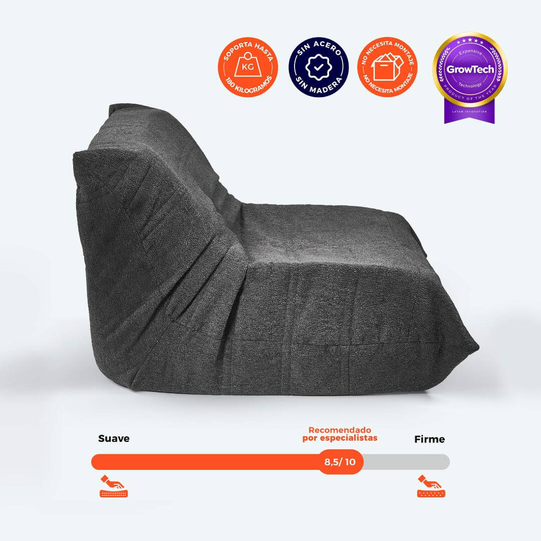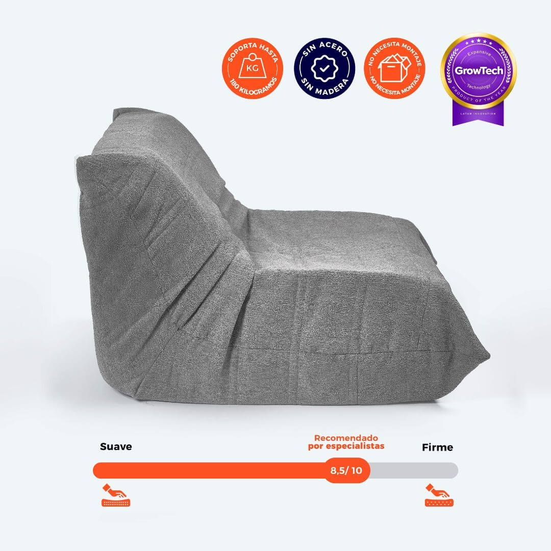 Gracias a la innovadora tecnología GrowTech®, cada sofá puede soportar de 130 a 150 kg, manteniendo su forma sin necesidad de madera ni aluminio. ¡Máxima comodidad garantizada!